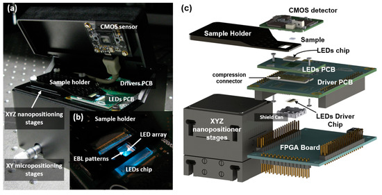 The first microscope was based on the Led1 chip and the CMOS SPAD camera. For this implementation, the Led1 chip was fixed at the bottom, whereas the sample rested on the sapphire substrate with two (XY) degrees of freedom. The camera was positioned on top of the stack-up by means of the XYZ microstager. A custom 3D-printed sample holder was designed to move the sample in direct contact with the Led1 chip. The rest of the setup was fabricated, including the two microstages used to align the sample and the camera with the LED chip, by a 3D aluminum computer numeric control (CNC) machining. The setup was enclosed in a dark box measuring 31 × 21 × 12 cm3 (Figure 7).