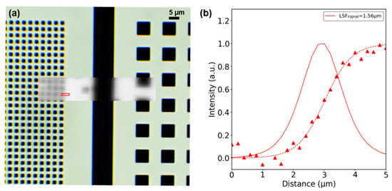 With this setup, smaller EBL structures were observed (Figure 10a). However, due to the performance of the LED array in which only a few LEDs worked, we decided to use only one LED and perform a 2D scan by moving the sample, emulating a larger LED array. Figure 10a shows the reconstructed image of the EBL pattern region with 1.6 µm and 6.4 µm squares, using a step size of 200 nm in both directions. The spatial resolution was determined by the edge spread function (ESF) and line spread function (LSF) methods [25] measured between 10–90%. The extracted resolution from one of the 1.6 µm square’s edges was 1.56 µm (Figure 10b), four times the expected resolution (400 nm), since the sample was placed directly over the nanoLEDs. However, further analysis of the nanoLED array configuration (by finite difference time domain simulations [26]) showed that the metal structure and the depth of the light emitter region affected the spot shape and size at the chip surface, degrading the resolving power of the setup.