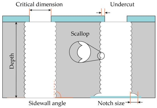 One of the challenging issues of the Bosch process optimization is the complex interplay between device design (topology dimensions and shape) and etch parameters. Experimental studies show that the etching rate primarily depends on the trench width; nevertheless, trench length and shape also affect the etching mechanism, but to a smaller degree [28,29]. Furthermore, for higher aspect ratios due to changes in etching mixture supply and removal conditions, the etching rate decreases with increasing depth (ARDE effect) [30]. To etch microstructures with different dimensions and shape, one has to design an etching process with overetch (for through etching of silicon), which needs a lager etching process window and higher selectivity. The overetching step in the process can lead to a notching effect, which takes place when the reactive mixture interacts with the bottom dielectric surface (SiO2) of the substrate [31]. There are several ways to eliminate this defect [32,33,34], but it requires additional process optimization and several additional steps.