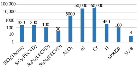 The Bosch process deep silicon etching (hundreds of microns deep) with a high aspect ratio (>20) requires an appropriate choice of protective mask. There are several materials compatible with dry etching processes and suitable for this purpose (Figure 2): silicon dioxide and silicon nitride, metal masks, and photoresists [15,16,17,18,19,20,21,22,23,24]. Particular mask choice can depend on not only selectivity but relies on available equipment and materials in the laboratory. From this point of view, thermal silicon dioxide is one of the most commonly used materials for MEMS devices. On the one hand, it provides high selectivity, which makes it possible to fabricate complex designs and get microscale resolution. On the other hand, silicon dioxide depositions and processing methods are well studied and do not require large resources for optimization [25,26,27]. Moreover, silicon dioxide is not susceptible to overheating during etching compared to photoresist masks and does not have a micromasking effect opposite to using metal hard masks.