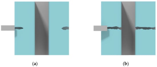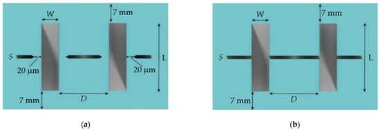 In order to investigate the influence of the sample cleaving method, a test topology was developed, which include the set of lines (with widths (W) from 2 to 50 μm and lengths (L) of 1 mm) with ratio (width (W) to distance between lines (D)) of 1:1 and 1:10 for each standard size. For all the structures with dashed auxiliary lines, the line width and the distance from the line to the target microstructure was 20 μm (Figure 7a). For the structures with transverse crossing lines, the width of the auxiliary line (S) was chosen as 5, 50, and 100 μm (Figure 7b). In all cleaving methods, the distance from the edge of the substrate to the test lines was at least 7 mm.