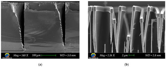 Micro-electro-mechanical systems (MEMS) are versatile microdevices that are widely used in many areas of human life from scientific research to industry [1,2,3]. Silicon microtechnology based on microelectronic techniques [4] is the key mass production fabrication method for creating microsystems. Compared to planar integrated circuits, MEMS 3D devices are always characterized by unique design (structures size and shape), individual materials stack, and device-friendly fabrication technology. Usually, highly sensitive state-of-the-art MEMS devices require forming a high aspect ratio (more than 20) microstructures with precisely controlled profiles [5,6]. The Bosch process is one of the most popular processes for deep anisotropic reactive ion etching of silicon, which has many modifications and allows one to make high aspect ratio microstructures [7,8,9,10]. The main Bosch process optimization parameters are the elimination of etching defects (“micrograss”, wall erosion, and wall roughness), etching rate nonuniformity, profile angle control over the wafer, etc. In addition, one should pay attention to ARDE (Aspect Ratio Dependent Etching) and microloading effects i.e., the influence of microstructure topology (different widths and shape) on the etching process. A process-dependent feature of the Bosch process is rippled sidewalls of the structures (Figure 1), which are unacceptable for some devices, for example, when creating through-silicon vias (TSV), and these require additional processing [11,12,13,14].