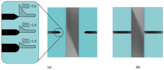 Two main methods of creating auxiliary cleaving lines (Figure 6) for the Bosch process characterization were chosen to compare their influence on target microstructures with sizes from 2 to 50 μm. In the first and second cases, dashed and transverse auxiliary crossing lines were formed during the etch process, and then substrates were cleaved along these lines. The key difference between these cases is an absence of a direct intersection between auxiliary lines and target microstructures. We analyzed various designs of stress concentrators (Figure 6a) for dashed auxiliary cleaving lines. The degree of stress increase depends primarily on the type and shape of the auxiliary line. The greater the cross-sectional difference in the transition section and the sharper the transitions and undercuts, the higher the local maximum stress occurs [50]. We choose angular structure as the main shape because it provides up to 5 times higher maximum stress than the nominal one.
