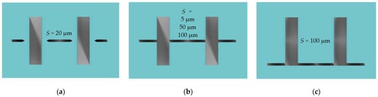 We decided to set target microstructures with dashed auxiliary lines as a reference for comparison with other types of lines (Figure 8b,c) because they have no direct intersections with auxiliary lines (Figure 8a) and evidentially have no additional influence during the etching process. It should be noted that fixed values of the dashed auxiliary line width of 20 μm (S) and the distance to the microstructure were chosen. When selecting it, we were guided by the fact that auxiliary lines should be deep enough after etching and close enough to target microstructures to control the cleaving. On the other hand, it should be as narrow as possible to minimize its influence on the etching process of target microstructures.