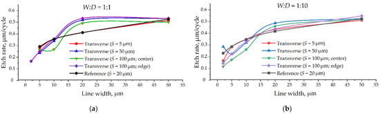 Etching rate depending on the target lines width: (a) For W:D = 1:1 aspect ratio; (b) For W:D = 1:10 aspect ratio.
