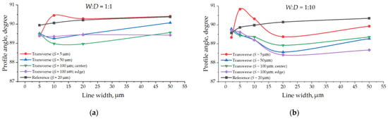 Profile angle depending on the target lines width: (a) For W:D = 1:1 aspect ratio; (b) For W:D = 1:10 aspect ratio.
