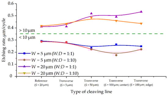 A pretty general tendency of increasing the etching rate with increased target line width can be observed on the graphs (Figure 9) based on the tabular data (Table 3 and Table 4). One can easily notice a huge difference in data and curve character for the same target microstructures depends on the cleaving method.