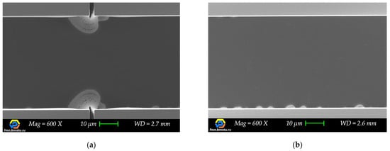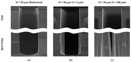 While analyzing a lot of target microstructures cross-sections with scanning electron microscopy (for different cleaving methods), we observed clear evidence and the source of change in etching behavior. We noticed that target lines with dashed auxiliary lines (reference, without intersection) have no profile narrowing during etching when the etching depth becomes bigger. Their shape was retained until the end of the etching. On the other hand, when switching to S = 5 µm transverse auxiliary lines, the “second” structure profile appeared (Figure 12b) at the intersection with the target structure, forming a narrower trench. For wider transverse auxiliary lines, for example, S = 100 μm, significant narrowing of the profile took place—up to complete stop of the etching process, which was observed for W < 20 μm in many cases (Figure 12c).