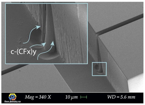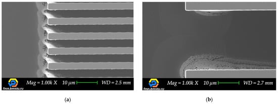 This change in etching behavior is associated with silicon “build-up” defects forming during the Bosch deep etching process. “Build-up” defects occur due to increased polymer formation at intersection areas, which prevents target microstructures etching and leads to the narrowing of trenches gradually. The reason is a local area of intersection, where additional geometry appears in the form of corners of target microstructures. Corners are subjected to additional action of ions on each side, which leads to more efficient polymer formation due to sticking coefficient increase [51,52,53]; moreover, the character of supply and removal of the gases mixture into the trench changes. Additionally, big grooves are formed at the bottom of the structure in the area of intersection, which may indicate local charge forming (on dielectric “build-up” defects) and etching particles deflection forming an additional etched area around (Figure 13).