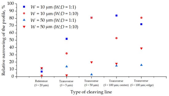 The relative narrowing of the profile per trench width depending on the type of cleaving line.