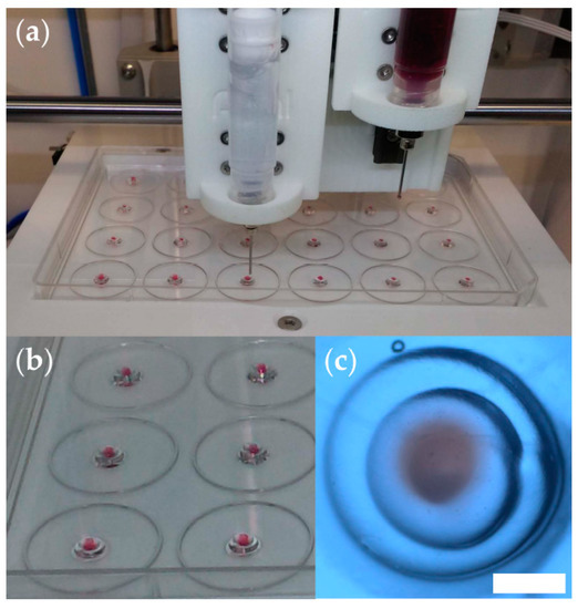 Figure 1 illustrates the reproducibility of the 3D printing process. As shown in Figure 1c, the tissue construct is about 3 mm in diameter, and the central spheroid (red) is about 0.8 mm in diameter. The actual bioprinting took place in the 24-well cell culture plate, and the tall walls of the wells hampered visualization (Figure S3).