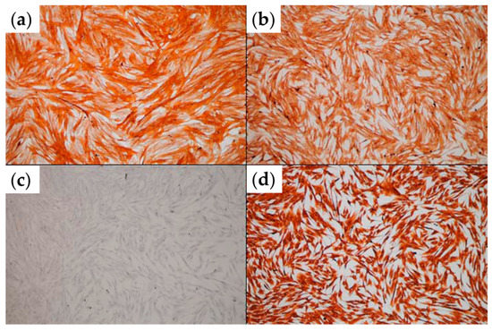 Immunocytochemical analysis of TAFs expanded in 2D culture. (a) α-SMA staining; (b) CD105 staining; (c) pan-CK staining; (d) vimentin staining (optical microscopy, ob. 10×).