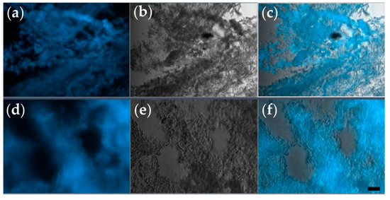 Representative cryosections of tissue constructs, prepared after 2 weeks of in vitro culture. (a–c) Section of the toroidal tissue construct; (d–f) section of the triple-layered tissue construct. Each section is visualized as a fluorescence microscopy image obtained via Hoechst staining (a,d), bright-field microscopy (b,e), and their overlay (c,f); (ob. 10×); scale bar = 10 µm.