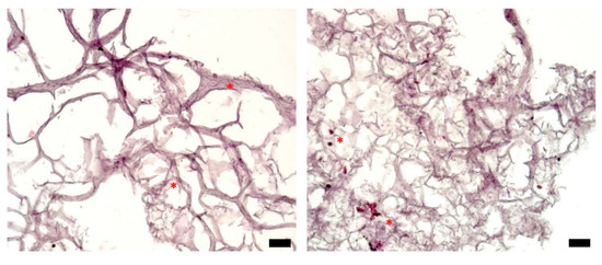 Histological analysis of representative sections of a triple-layered tissue construct (HE staining), day 0; optical microscopy, ob. 10×, scale bars = 10 µm. Stars highlight cells located in the bulk of the hydrogel.