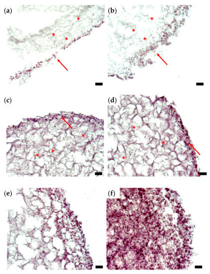 Histological analysis of representative sections of a triple-layered tissue construct (HE staining): (a,b) day 6; (c,d) day 10; (e,f) day 14; optical microscopy, ob. 10×, scale bars = 10 µm. Stars indicate cellular distribution on the inner part; arrows point to the exterior part of the structure, which is intensely populated with cells.