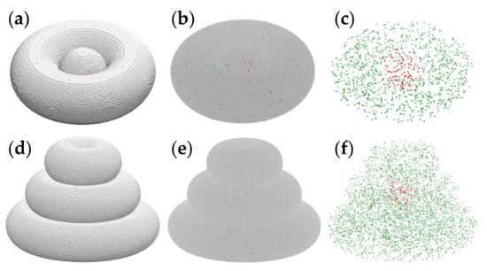 Computational models of the toroidal structure (a–c) and triple-layered structure (d–f), visualized using VMD [40]. Cancer cells are pictured by red spheres, whereas peritumoral cells are depicted as green spheres. (a) The toroidal tissue construct is represented on a cubic lattice, with 1.2 × 106 cell-sized volume elements of the hydrogel pictured as silver spheres. (b) The toroidal structure with the hydrogel is shown as a translucent gray medium. (c) The cellular components of the toroidal tissue construct (i.e., hydrogel not shown): 109 tumor cells and 1033 peritumoral cells. (d) The triple-layered tissue construct, with about 3.8 × 106 volume elements of hydrogel shown explicitly as silver spheres. (e) The triple-layered structure with the hydrogel is represented as a translucent continuum. (f) The 125 tumor cells and 3716 peritumoral cells are comprised by the computational model of the triple-layered structure.