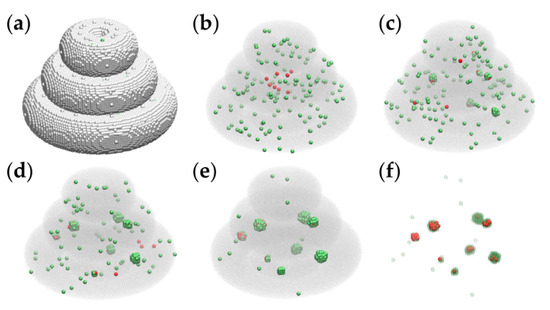 Representative MMC simulation snapshots of the evolution of a triple-layered tissue construct built on a cubic lattice at the scale of 1:3. Tumor cells and peritumoral cells are represented by red and green spheres, respectively. (a) The initial state containing about 1.4 × 105 cell-sized volume elements of the embedding hydrogel is pictured as silver spheres. (b) The initial state, showing the hydrogel as a translucent gray medium, contains 8 tumor cells and 137 peritumoral cells; (c) the configuration obtained by running the simulation for 2 × 103 MCS; (d) the result of 5 × 103 MCS; (e) the outcome of 104 MCS; (f) the result of 104 MCS with the embedding hydrogel removed, and the peritumoral cells represented as transparent green spheres—to visualize the relative positions of malignant cells and peritumoral cells.