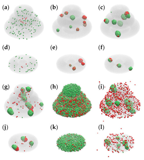 Figure 8 presents the impact of model parameters on the outcome of the MMC simulations for both models: triple-layered (a–c, g–i) and toroidal (d–f, j–l); the first two panels of the above lists Figure 8a,d depict the initial configurations of the two models, whereas the other panels are snapshots of the simulation taken after running 2×104 MCS with the parameter sets 1 to 5, respectively (given in Table 1).