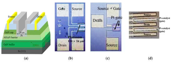- Kim, H.W.; Jang, S.W. AlGaN/GaN HEMT based hydrogen sensor with platinum nanonetwork gate electrode. Curr. Appl. Phys. 2013, 13, 1746–1750. [Google Scholar] [CrossRef]