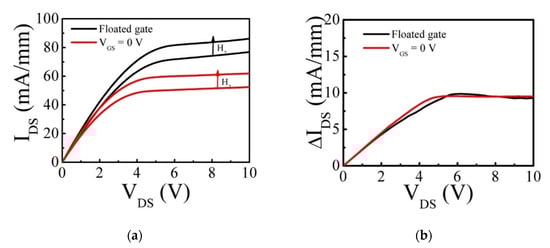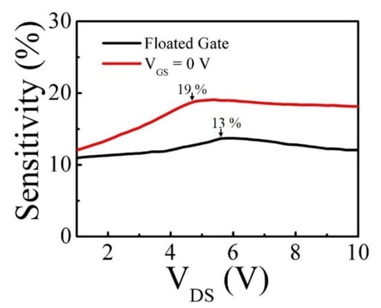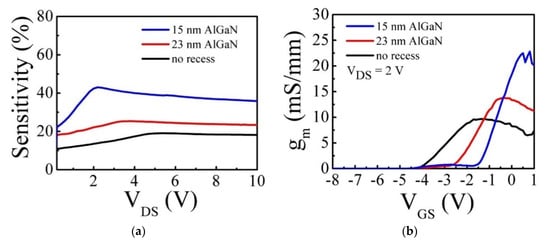 When the sensors were exposed to H2 gas flow, an interfacial dipole layer was formed at the Pt/AlGaN interface and reduced the Schottky barrier height, resulting in an increase of the channel current (IDS), as shown in Figure 2a. The output characteristics of a standard (no-recess) HEMT sensor showed that IDS was increased by H2 exposure. The response in percentage was defined as (IH2 − Iair)/Iair, where IH2 and Iair are the IDS measured with and without H2 exposure, respectively. Interestingly, the maximum response was improved from 13 to 19% at VGS = 0 V in comparison to the gate floated, as shown in Figure 3. This response enhancement can be explained by Figure 2b, indicating that the amount of the current change (ΔIDS) by H2 detection was not different, although the drain current was decreased by a zero-gate voltage.