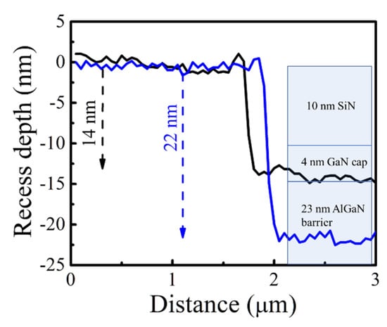 The etch depth of the gate region recess measure by AFM. The etch depth of 22 nm corresponds to the remaining AlGaN thickness of 15 nm.