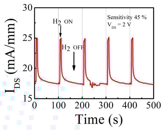 Transient-response characteristics to hydrogen of a 3-terminal standard sensor with 15 nm-AlGaN measured with VGS = 0 V, VDS = 2 V at 200 °C—one cycle included 4% hydrogen in argon injection for 5 s followed by a recovery period.