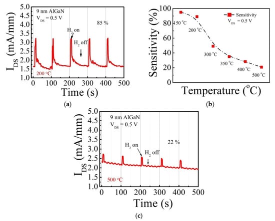 Hydrogen gas is considered as an energy carrier in the modern world, and possesses outstanding properties and features that make it become a very promising source of energy for automotive or fuel cell applications, although it is not naturally available as a ready-to-use substance [1,2,3]. However, when using hydrogen gas at high temperatures, there emerge two main concerns, including high-temperature hydrogen attack (at least 200 °C), and auto-ignition (at 500 °C). According to that reason, detection of hydrogen leaks is very important, especially at high temperatures. Gallium nitride possesses a wide bandgap of 3.2 eV and a high critical electric field of 3 MV/cm, thereby leading the device operation with a very low leakage current in high temperatures and extreme environments. The AlGaN/GaN heterojunction also induces two-dimensional electron gas (2DEG) with high electron mobility, which enables a prompt response. Therefore, GaN heterojunction-based sensors can be a strong candidate for a hydrogen sensor platform that requires a high temperature operation for an active catalytic reaction in hydrogen, which is well above the temperature limitation of silicon devices. Pt/AlGaN/GaN-based sensors have been widely investigated because they demonstrated the potential to respond towards the hydrogen presence [4,5,6,7]. When the H2 molecules are adsorbed onto the Pt surface, they are decomposed into hydrogen atoms, penetrate through the Pt layer, and form an interfacial dipole layer at the metal–semiconductor interface. The dipole layer reduces the Schottky barrier height and induces the negative shift of pinch-off voltage, thus increasing the drain current [8,9,10]. Consejo et al. reported experimental results indicating that a change of channel conductivity by hydrogen incorporation is mainly caused by carrier density change, and the change of carrier mobility has a negligible effect [11]. In many literatures, hydrogen gas sensors with AlGaN/GaN heterostructures employed Schottky diodes or floating-gate HEMTs [12,13,14,15,16,17,18,19]. Although a HEMT-type device with three terminals, including the source, drain, and gate, can have an advantage of modulating the response by tuning gate bias [20], it requires an additional interconnection and eventually increases the complexity of integration between sensor arrays and readout circuitry. Two-terminal GaN HEMT sensors with a floating Pt-gate also demonstrated H2 sensing performance [21,22], but they cannot take advantage of gate modulation to enhance the response. GaN HEMTs are normally-on devices in which the channel current conducts at VGS = 0 V due to the 2DEG channel being induced at the AlGaN/GaN interface. Zero-gate potential can be easily assigned by connecting the gate and source electrodes as a common electrode, and this configuration is attractive when the sensor performance is optimized at VGS = 0 V. In this work, the enhanced response was achieved when the transconductance (gm ) was increased at VGS = 0 V by thinning the AlGaN barrier, because 2DEG is very sensitive to the surface potential.