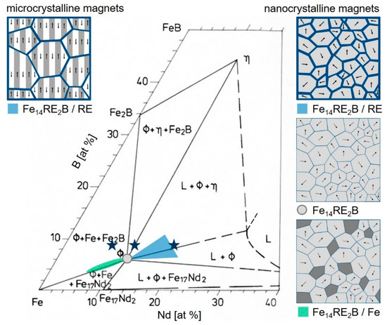 Although additive manufacturing based on laser powder bed fusion (L-PBF) is well established to fabricate sintered and fully dense metallic components [7], processing of Fe-Nd-B material by this technique is challenging. There are three reasons for this: First, Fe-Nd-B has an extreme sensitivity to oxidation. Second, there is a lack of powders with a spherical morphology required for a good quality of the printed structures. Third, only quite specific microstructures enable good permanent magnet properties such as high coercivity Hc, high remanence Jr and high maximum energy density (BH)max. Such microstructures are composed of small hard magnetic grains on the µm or nm scale (Figure 1). Conventional powder metallurgical processes enable anisotropic microcrystalline magnets with hard magnetic grains of 1–20 µm in size (multi-domain grains) separated by a paramagnetic rare earth (RE) rich grain boundary phase. Conventional melt-spinning results in isotropic nanocrystalline magnets with hard magnetic grains of size 10 to 200 nm (single domain grains). Depending on the choice of the alloy composition three different types of nanocrystalline permanent magnets can be realized. First, magnets with excess RE contain hard magnetic grains which are separated by a paramagnetic RE rich grain boundary phase. Second, stoichiometric magnets are composed of hard magnetic grains which are in direct contact. Third, magnets with overstoichiometric Fe are composites of hard magnetic grains and soft magnetic grains [8,9,10,11].