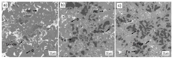 The different Fe-Nd-B based alloys in as cast state (scanning electron microscopy images, backscatter electron detector): (a) P-RE-18, (b) P-RE-12 and (c) P-RE-8. Corresponding phases were assigned to the measured compositions.