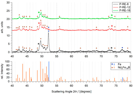 Diffractograms of the three pre-alloys (measured as powders). Detected phases α-Fe and 14:2:1 (ϕ) with their corresponding peaks are shown below. Additionally, the phases that have been identified in the X-ray diffraction (XRD) chart (ϕ phase, α-Fe for P-RE-8 and P-RE-12, ϕ phase for P-RE-18) are marked in the diffractograms. The asterisk marks two unidentified peaks that probably belong to the rare earth (RE) rich phase.
