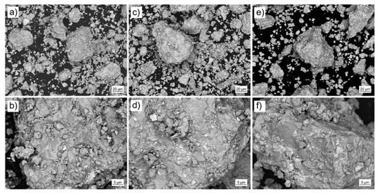 The different Fe-Nd-B based powders used in the laser powder bed fusion (L-PBF) process (scanning electron microscopy images, backscatter electron detector, in lower (top) and higher (bottom) resolution): (a,b) P-RE-8, (c,d) P-RE-12 and (e,f) P-RE-18.