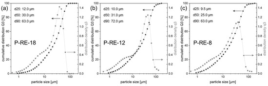 Particle size distribution (cumulative distribution Q3, distribution density q3) using laser diffraction of the powder fraction < 63 µm for the powder of the alloy (a) P-RE-18, (b) P-RE-12 and (c) P-RE-8. The values of d25, d50 and d90 are additionally listed.