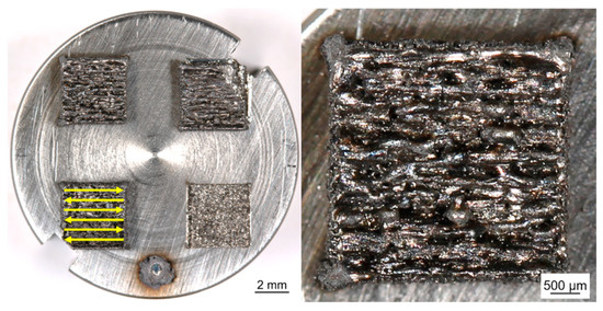 Example of printed Fe-Nd-B selective laser melting (SLM) part (P-RE-18) in top view. Scan strategy is illustrated by yellow arrows.