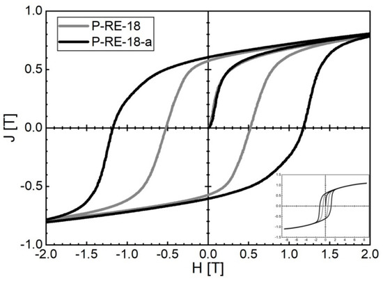 Room temperature hysteresis loops of P-RE-18 produced by L-PBF additive manufacturing: as-built state (P-RE-18, dark grey) and state after two-step post-annealing (600 °C for 10 min and 500 °C for 60 min) (P-RE-18-a, black).