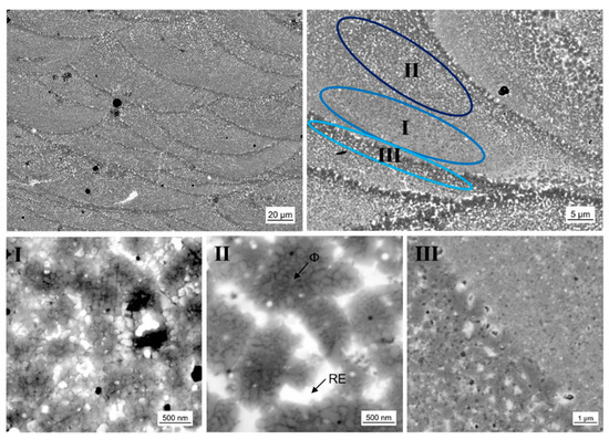 In contrast to the samples with overstoichiometric Nd (P-RE-18), for the close-to stoichiometry sample (P-RE-12) and the sample with overstoichiometric Fe (P-RE-8) the microstructure inside the laser melt pools is rather consistent throughout the volume (Figure 10). In the case of P-RE-12 (Figure 10a–c) we propose a microstructure that is similar to zone II of P-RE-18 shown in Figure 8. Assumingly, Fe has been primarily formed (black dots in the center of the grains). The hard magnetic ϕ phase formed surrounding the Fe as grains. These ϕ grains are surrounded by structures composed of nanocrystalline grains which could be eutectic. The size of these structures is in the range of 1 to 2 µm, while the grain size of the nanocrystalline grains inside the structures amounts to about 100 to 200 nm. The peritectic solidification of the ϕ phase and eutectic of Fe or η stands in accordance with literature information of the ternary phase diagram Fe-Nd-B [12,30]. A phase of bright contrast (probably Nd-rich ternary eutectic) separates the structures. Similar solidification mechanisms could lead to the nanograin structures in P-RE-18 as shown in Figure 8, zone II. In the case of P-RE-8 (Figure 10e–f) the microstructure inside the laser melt pools consists of grains that are assumed to be of hard magnetic ϕ phase and small grains of darker contrast, that are assumed to be of soft magnetic Fe phase. The grain size distribution of the ϕ grains with grain diameters in between 150 and 500 nm is rather broad. The Fe grains seem to be significantly smaller. For phase allocation the same meaningful indicators have been used as in Section 4.1. The XRD analysis and thermomagnetic analysis of the 3D-printed parts are again given in the supplementary document (Figures S1 and S2). Concerning the heat-affected zone at the laser melt pool interface (region III in Figure 8), both P-RE-12 and P-RE-8 show a thin layer composed of coarser grains (layer thickness: 2–3 µm, grain size: ~1 µm).
