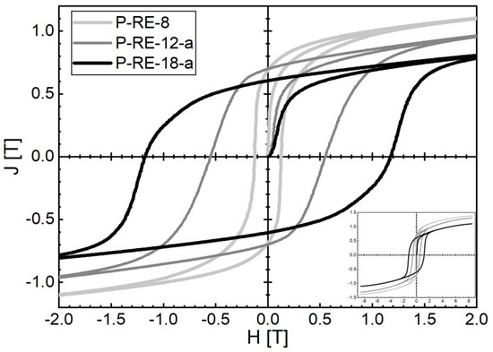 Room temperature hysteresis loops of P-RE-12-a (optimized by post-annealing) (dark grey) and P-RE-8 (light grey) samples produced by L-PBF additive manufacturing. For comparison, the hysteresis loop of P-RE-18-a (optimized by post-annealing) (black) is also shown. It must be noted that the samples with the best magnetic properties achieved so far have been selected in the plot for the three different compositions to demonstrate the potential of the method for the three different regions in the phase diagram to produce bulk nanocrystalline FeNdB.