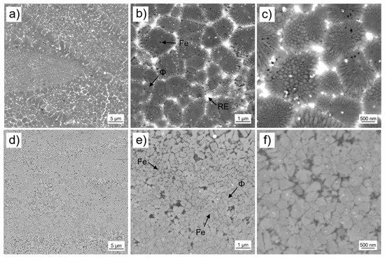 Scanning electron microscopy images using backscatter electron detector of the microstructure of L-PBF samples of close-to stoichiometry composition (P-RE-12) (a–c) and of overstoichiometric Fe composition (P-RE-8) (d–f). The bright regions are assumed to be the RE rich phase, the gray regions/grains to be the hard magnetic ϕ phase and the dark spots to be Fe grains.