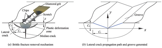 In this paper, only the dominating brittle fracture removal mode was considered. This method has been used and validated in other studies [17,18]. The brittle fracture removal in the grinding of ceramics is likened to the indentation fracture process, as illustrated in Figure 1a. As the diamond grit cuts the workpiece gradually, the deformation zone is formed under the diamond grit. Then, the medial crack is generated and propagates toward the inner part of the workpiece. The lateral cracks initiate and propagate as the diamond grit leaves the workpiece gradually. Finally, the material removal is formed as the lateral cracks reach the workpiece surface. The length and depth of the lateral cracks can be calculated as Equations (1) and (2) [19]. The diamond grits were assumed to be rigid octahedrons of the same size, as shown in Figure 2.