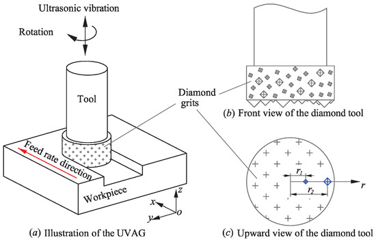 - The effects of the diamond grits’ random distribution, brittle fracture removal, and ultrasonic vibration on the surface roughness were considered during the modeling process. This provided an in-depth understanding of the formation of surface roughness in the UVAG of ceramics and can be also considered as the basis for future parameter optimization.