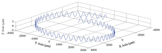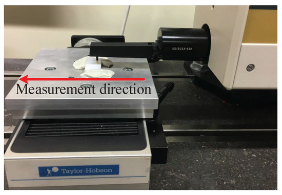 The maximum spindle rotational speed with ultrasonic vibration was 10,000 , while the maximum spindle rotational speed without ultrasonic vibration was 42,000 . The vibration frequency varied from 20 kHz to 50 kHz for the different tool-workpiece systems adopted. The vibration amplitude was measured by a laser vibrometer (Polytec OFV 353 sensor head and OFV 2200 vibrometer controller). The tool used in the experiments was provided by Schott Diamantwerkzeuge GmbH in Germany, and it was a diamond metal-bonded solid tool with a diameter of 6 mm and a diamond grit size of D91. The Taylor Hobson profilometer was used to measure the surface roughness of the slots, as illustrated in Figure 10. The measurement direction was the same as the feed rate direction. Each slot was measured six times, and the arithmetic average value was obtained as the global surface roughness of the slot. The cut-off was 0.8 mm; the measurement length was 8 mm; and the spacing was 0.8 mm.