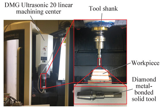 As illustrated in Figure 9, the slots were machined with the UVAG method. The machining center (DMG Ultrasonic 20 linear, DMG, Berlin, Germany) mainly consisted of an ultrasonic spindle system, a numerical control machining system, and a coolant system.