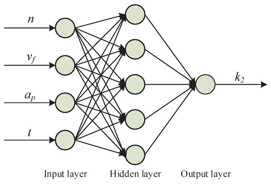 contains the effect of the tool motion on the grooves overlapping and tool wear. The tool wear was not linear with time: initially, it increased sharply, then it remained stable, and finally, it rose rapidly again. Therefore, using the linear estimation or least squares estimation to calibrate was not effective. In this case, the backpropagation neural network algorithm was chosen to get the function . A typical backpropagation neural network usually consists of an input layer, a hidden layer, and an output layer. According to the expression of , the number of neurons of the input layer was selected as 4. The number of hidden layers was 1, and the number of neurons was 5. The number of output neurons was 1, and the structure of the backpropagation neural network is shown in Figure 11. Before inputting the training sample, the experimental data needed to be normalized, and the data of each parameter was normalized to the interval (0, 1). The training program was written in MATLAB, and the momentum gradient descent method was used to train the established neural network model. The minimum error of the training target was 0.0005, and the maximum allowed training step size was 200,000 steps. The training model was used to train 12 sets of odd-group experimental data. When the training error was less than the minimum error of the training target, the training ended, and a backpropagation neural network prediction model for was formed. Then, the comprehensive predictive model for the surface roughness could be obtained. The comparison between the experimental results and the prediction results is shown in Figure 12.