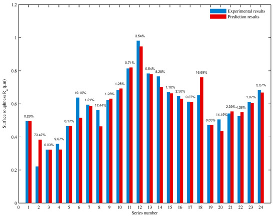As shown in Figure 12, the predictive results agreed well with the experimental ones, and the total average relative error was 7.57%, which means that the proposed model can be used for surface roughness prediction. For the relative error of each individual experiment, the maximum value was 73.47% in the second experiment. This could be caused by the micro-breakage of the sharp cutting edges. A new diamond tool was used for the first 12 groups of experiments, and another new tool was used for the last 12 groups of experiments. The cutting edges of the grits were sharp in the initial process. These sharp edges were apt to break with the assistance of vibration, and in this way, numerous micro edges were formed. These micro edges improved the surface quality distinctively, which resulted in an evident decrease of the surface roughness value (from 0.4954 µm in the first experiment to 0.2205 µm in the second experiment). The micro-breakage phenomenon was also mentioned in Ding et al. [24]. Therefore, the abrupt change of the surface roughness value in the second experiment led to a large deviation between the prediction and experimental results. If the second experiment were removed from the verification, the total average relative error could be 4.71%, which indicated a high prediction accuracy of the proposed model.
