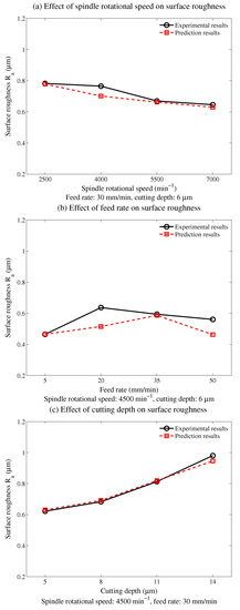 The effects of the input variables on the surface roughness are illustrated in Figure 13. From the experimental results, the surface roughness showed a downward trend as the spindle rotational speed increased, while it showed a reverse trend as the cutting depth increased. With increasing feed rate, the surface roughness showed a fluctuating growth trend. Similar effects can also be found in the prediction results, which further validate the proposed model. Similar results were also obtained in previous studies [2,8].