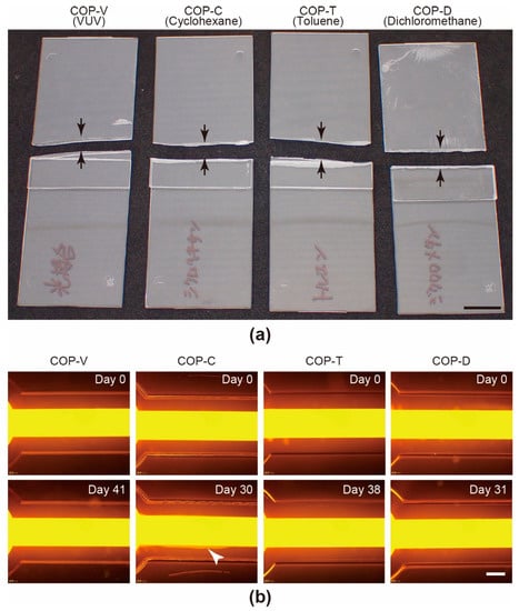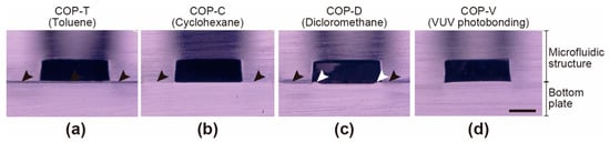| Bonding process | Vacuum ultraviolet (VUV) photobonding | Solvent bonding (cyclohexane) | Solvent bonding (dichloromethane) | Solvent bonding (toluene) |