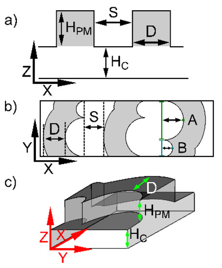 Parameter values of microfluidic channels with DCMS in the ceiling of the microfluidic channel. The table lists all combinations of the parameters implemented by the lithography process. The design parameters are schematically illustrated in Figure 1. The master molds on the four wafers were realized for fabrication of channels with total heights: Wafer 1 (W1) = 40 µm, Wafer 2 (W2) = 60 µm, Wafer 3 (W3) = 80 µm and Wafer 4 (W4) = 100 µm. Sixteen different channels with design parameter variables were fabricated. All channels had a width (along the y-direction) of 100 µm, and a mixing channel length (x-direction) of 1 cm.
