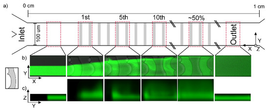 The developing flow pattern along the channels can also be observed in the YZ projections (Figure 2c), where the DCMS structures induces a combined migration (1st mixing structure) and a region of increased fluorescence in the part of the channel opposite the injection side (5th mixing structure). The latter could indicate that a swirling motion has taken place. Such a rotational flow is more evident after 10 structures, although a more heterogeneous distribution remains after 50% channel length. A similar analysis was performed for the surface layer (SL) (Figure A1) of the DCMS structures as a basis for comparison to the bulk flow. The developing homogenization process, as viewed in the XY projections, are considered to be similar for the SL as compared to the bulk movement. While the above development of the flow pattern is observed when the Y-channel inlet guiding the fluorescently labelled stream to the initial long curve is observed, reverting the labelled fluid to the alternative inlet will generate the “mirror” image of the observation reported in Figure 2b. Thus, the unlabeled part of the developing pattern reflects the initial distance-dependent reduction of the spread across the channel (Figure 2b 1st) for the DCMS structures.