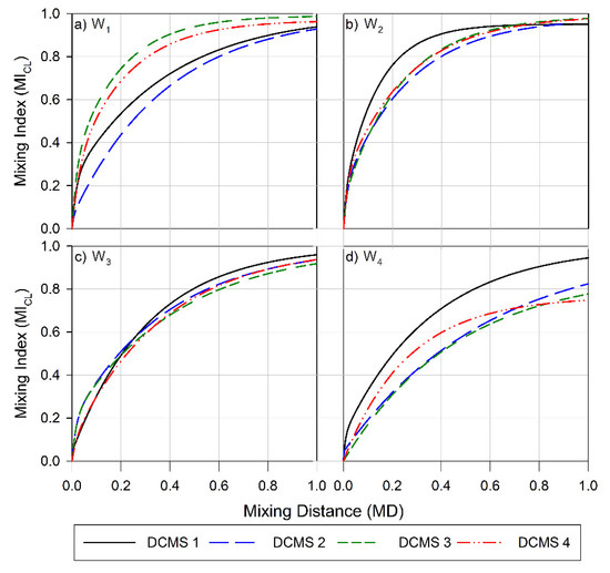 The most efficient DCMS, W1 DCMS 3 resulted in an MI of 0.99, whilst the least efficient, W4 DCMS 4, was 0.75, leaving a range from 0.75 to 0.99 for the MI at the outlet (after 1 cm of mixing). We compared these results to the CMS group reported previously [56], which showed an MI range from 0.99 (W2 CMS 1) to 0.85 (W1 CMS 2). The more extended overall range of MI at the outlet of the DCMS (0.75–0.99) as compared to that reported previously for the CMS (0.85–0.99) using similar spacings and pitches, indicating that the MI at the outlet are more sensitive to parameter values in the DCMS design than the CMS design. A similar relationship was also experienced at the surface of the channels, where the MD0.6 range was 0.11–0.53 cm and 0.06–0.32 cm for DCMS and CMS respectively (Table A1).