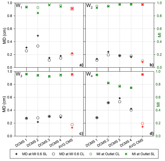 A similar trend was also observed for W2 DCMS 1, where a rapid initial increase in MI resulting in an MI of 0.9 after roughly 0.3 cm, produced the lowest MI at the outlet, for the same wafer designs (Figure 3b). This indicates the presence of different length dependencies of the processes, inducing the homogenization throughout the channel or different optimal sensor locations. For example, comparing the MI for CL and SL illustrates this, where W1 DCMS 2 (Figure 4a) clearly indicate a difference in the MI and MD0.6 analyzed based on CL or SL. Nevertheless, the trend in performance still holds true, as the CL shows a shorter MD0.6 and a larger MI compared to the SL.