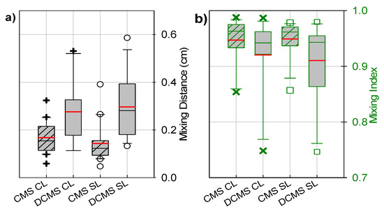 Boxplots depicting (a) a range of mixing distances required to achieve a mixing index of 0.6 (black) and (b) a range of mixing indices at the outlet (green) for the channel layers (CL) (black + and green ×) and surface layer (SL) (black ○ and green □) for the CMS (striped box) and DCMS (gray box) groups. The red and black/green lines within the boxes depict the mean and median values, respectively. The box corresponds to the interquartile range (50% of the data), whilst the lines (┬ ┴) represent 1.5× the interquartile range. The CMS data were obtained from our previous study [56].